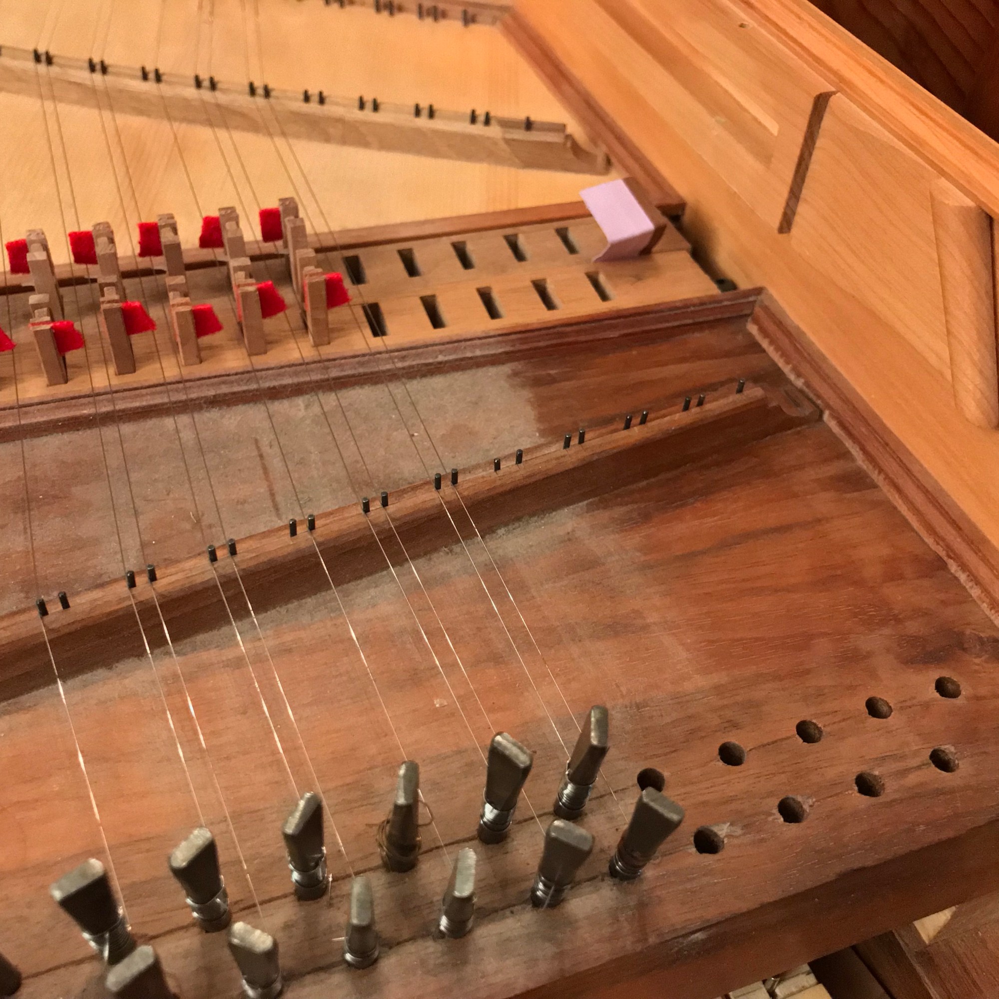 – clavecin italien de Soumagnac : cordage, harmonisation, sautereaux neufs en bois, reprise du diapason